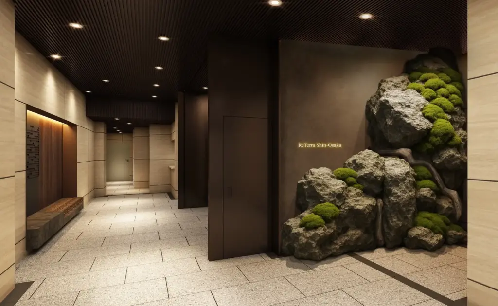 1階エントランスにはモニュメントとなる自然素材と人工素材を組み合わせたアートウォール(擬岩)を設置。各階共用部には木のぬくもりや緑の潤いを感じられるサインや屋内緑化を設ける。