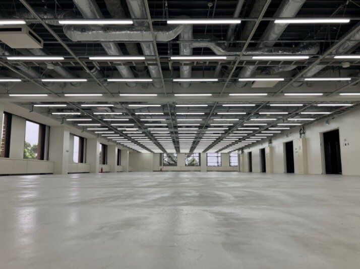 貸室は72~881㎡まで、最大15区画を設ける。設備・仕様としては局所排気や給排水の使用にも対応。ビル共用部に設けられた職域食堂や1階オフィスエントランスの共用ラウンジ、外部緑地などと合わせて快適な研究環境を提供する。