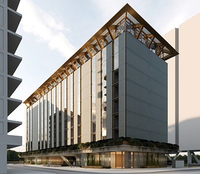 同計画は総開発面積9200㎡、延床面積6300㎡、RC・木造混構造地上9階地下1階、総戸数217戸のコリビング型賃貸用集合住宅。地下1階と地上1階がRC造、2~9階が木造で、一般的なRC造と比較して建築時のCO2排出量で約3割の削減を目指す。さらに約1800m3の木材使用により約1500トンのCO2固定効果が期待できるという。また、豪州の環境認証である「Green Star」で5Starを取得するなど、環境配慮と快適性を両立させた住宅として開発する。