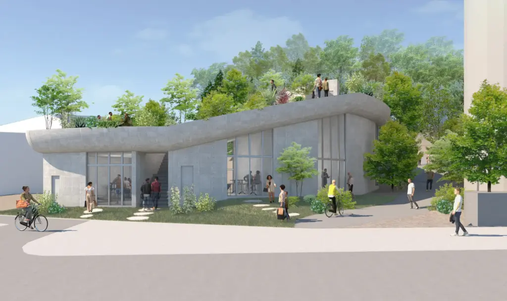 同施設は敷地面積2361・52㎡、延床面積675・20㎡、RC造2階建て、ランドスケープ一体型デザインの複合施設。
