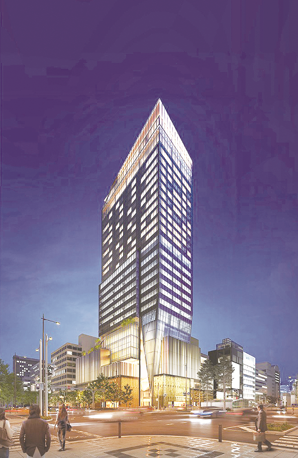 建物は敷地面積約3289㎡、延床面積約4万6227㎡、地上28階地下2階建て。地下と低層部を商業施設、中層部をオフィス、高層部をホテルとする複合ビル。都市のランドマークとして設計し、エントランスや吹き抜けにアートを取り入れる。