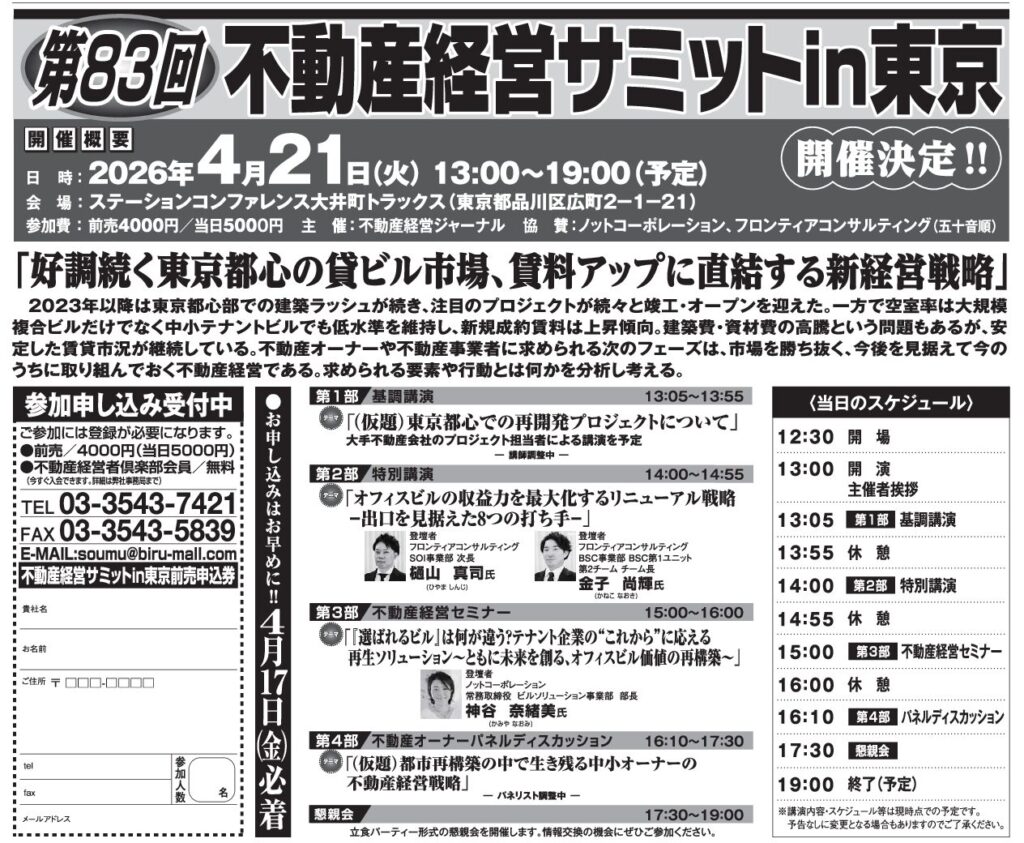 第83回不動産経営サミットin東京 開催 「好調続く東京都心の貸ビル市場、賃料アップに直結する新経営戦略」 毎年4月開催の不動産経営ジャーナル主催セミナー「不動産経営サミットin東京」。 本年も開催が決定いたしました。 皆様のご来場を心よりお待ちしております。