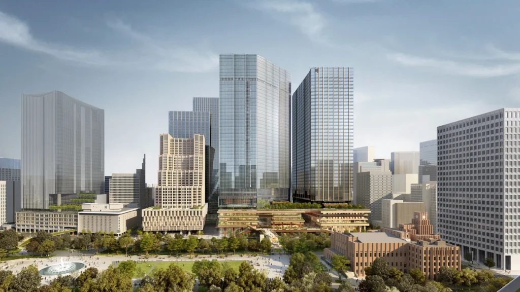 南地区のタワー棟は敷地面積約1・9ha、延床面積約29万㎡、地上46階地下3階建ての複合ビル。竣工は2028年度を予定している。11~44階には総貸床面積約15万㎡、基準階面積約1400坪の無柱オフィス空間を整備。また個室タイプからフリーアドレスのコワーキングまでニーズに合わせたワークスペース併設のオフィスサポートエリアを設置・導入する予定。地上1階~8階にはウェルネス促進施設、ホテル、商業を整備する。
