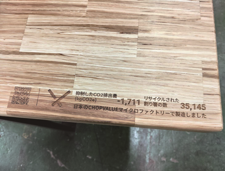 訪問した時につくっていたのは、この特製材で作ったコースターだ。ジェームス・ソバック社長によると、そのコースター1つにつき約75本の割り箸を使用しているという。こうした方法で、コースターだけでなくベンチやテーブル、壁面パネル、様々な雑貨などを作っている。ユニークなのは、クライアントの要望によってその製品に使われた割り箸の本数と、割り箸を廃棄した時と比べて、どれくらいのCO2排出が抑制されたかを刻印するところ。自分たちが使った割り箸が回収されて、実際にどれくらいの環境負荷低減につながったかを見える化している。回収に協力した人にとっても、そして店舗にとっても身近なところから取り組むことが地球環境に貢献していることがわかりやすい形になっている。